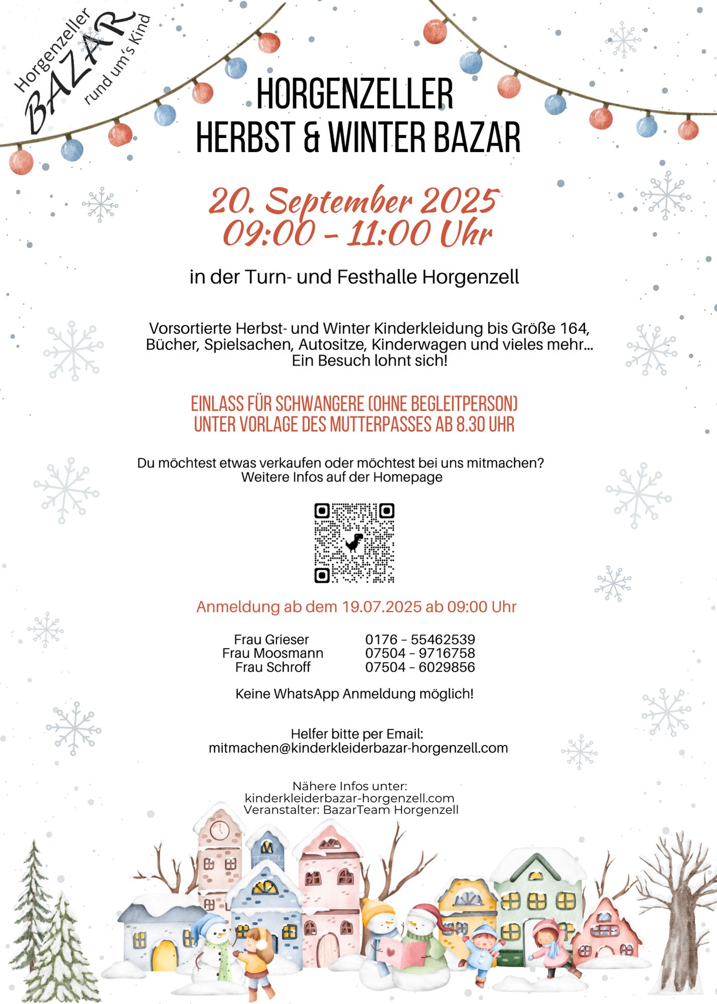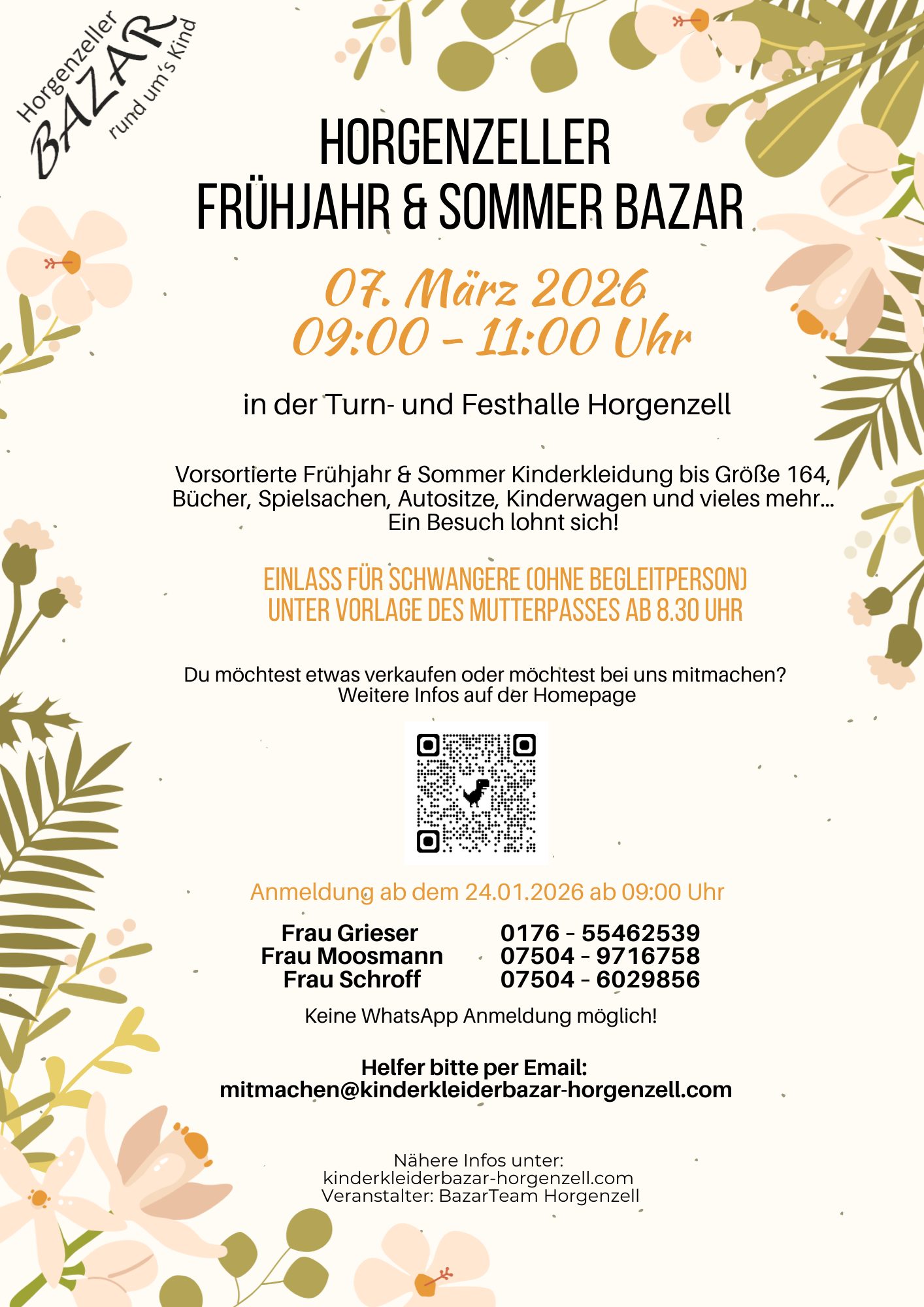 Willkommen beim Bazar rund ums Kind in Horgenzell Wann? 07. März 2026von 09:00 Uhr – 11:00 UhrEinlass für Schwangere (ohne Begleitperson) unter Vorlage des Mutterpasses ab 8:30 Uhr Wo? Mehrzweckhalle und BürgersaalKornstraße 4688263 Horgenzell Was gibt es? Vorsortierte saisonale Kinderkleidung bis Größe 164, Bücher, Spielsachen, Autositze, Kinderwagen und vieles mehr…Kaffee und Kuchenverkauf durch den Elternbeirat Kita St. Raphael Horgenzell.Ein Besuch lohnt sich! Hier gibt's den Flyer Du möchtest etwas verkaufen oder möchtest bei uns mitmachen? Jetzt Verkaufen / Mitmachen! Facebook Instagram